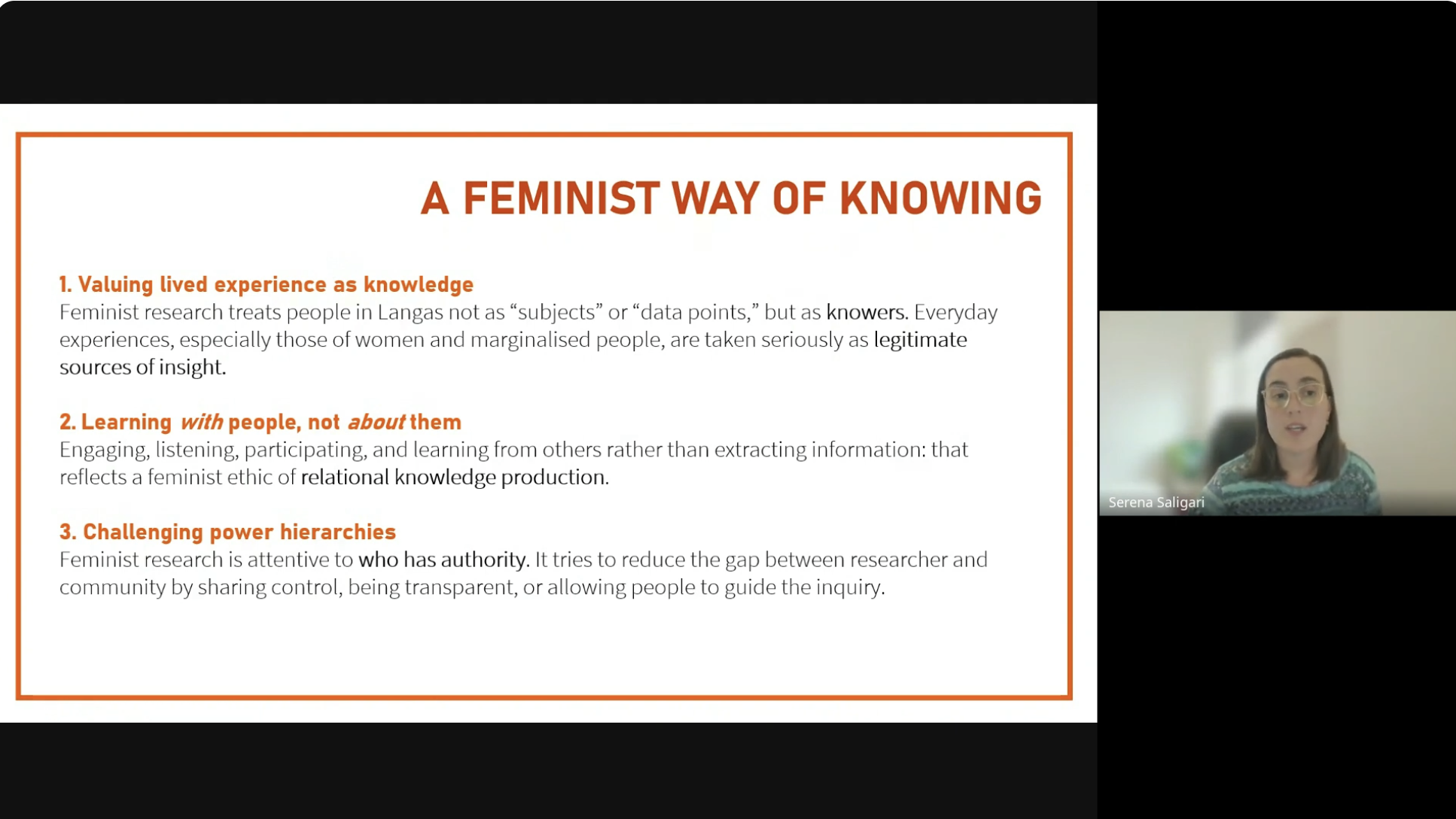 Their presentations highlighted two distinct yet complementary research approaches, illustrating how feminist methodological commitments shape the everyday work of research and how these commitments are grounded in care, relationality, and a wider political orientation toward change and transformation.