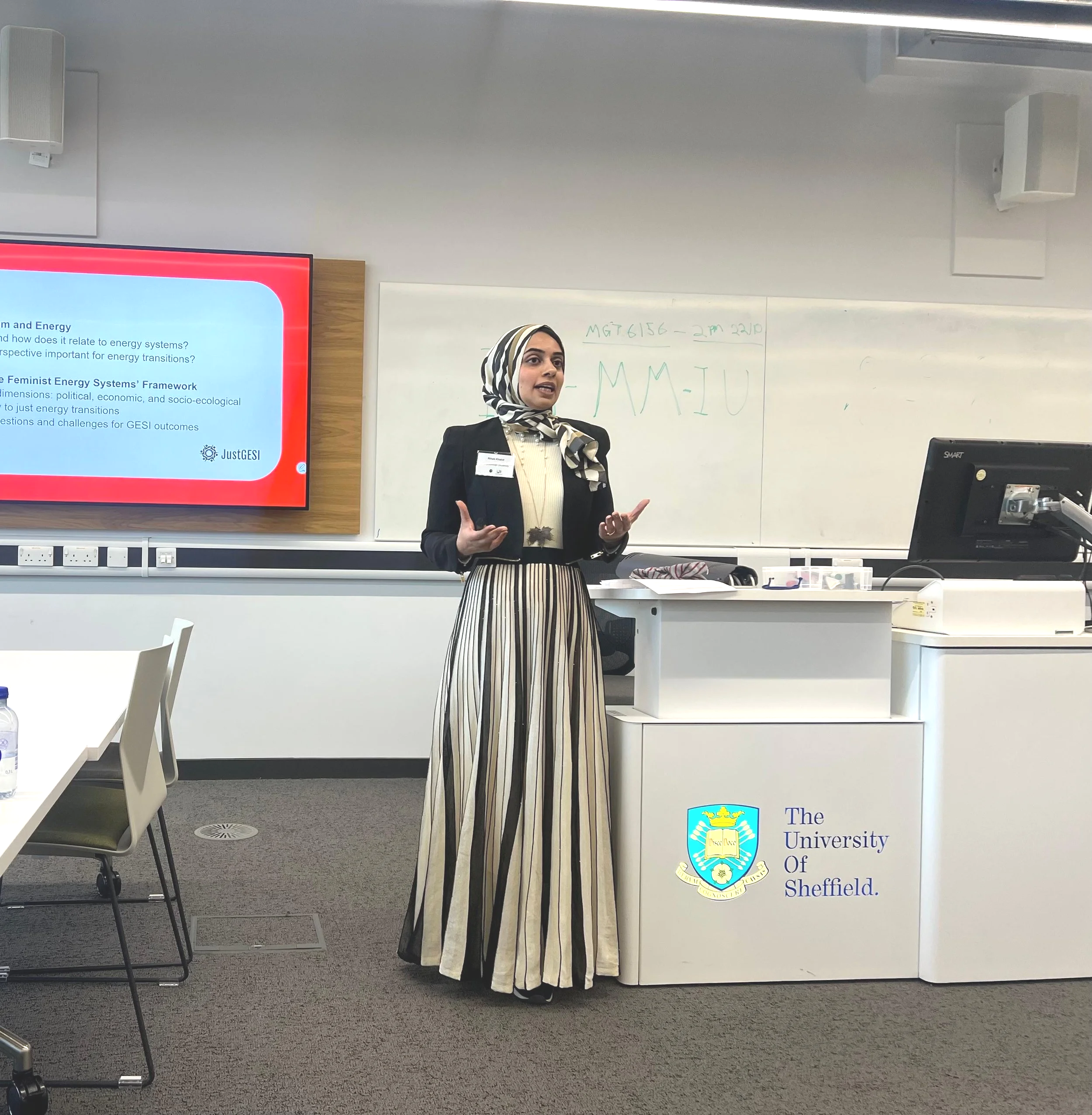 JustGESI team member, Dr Rihab Khalid, presenting on feminist energy systems during the launch event. (Photo Credit: Vicky Simpson)